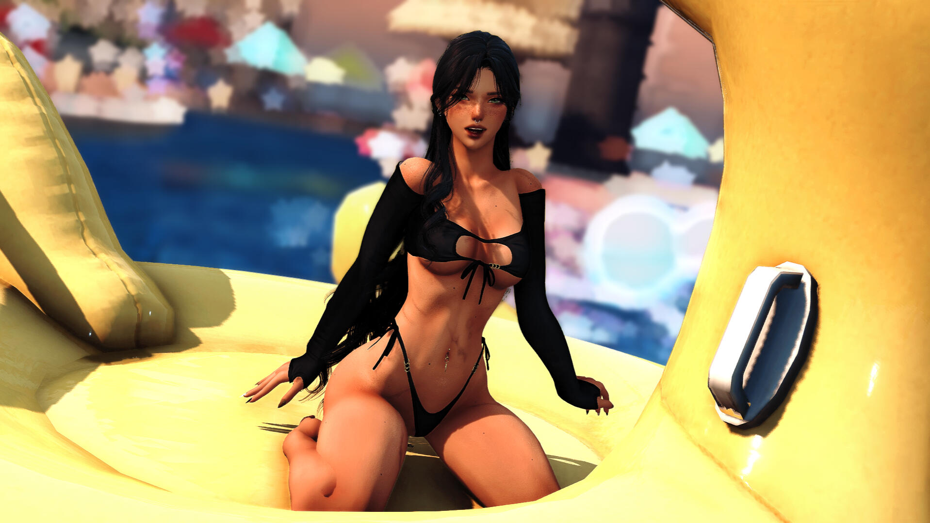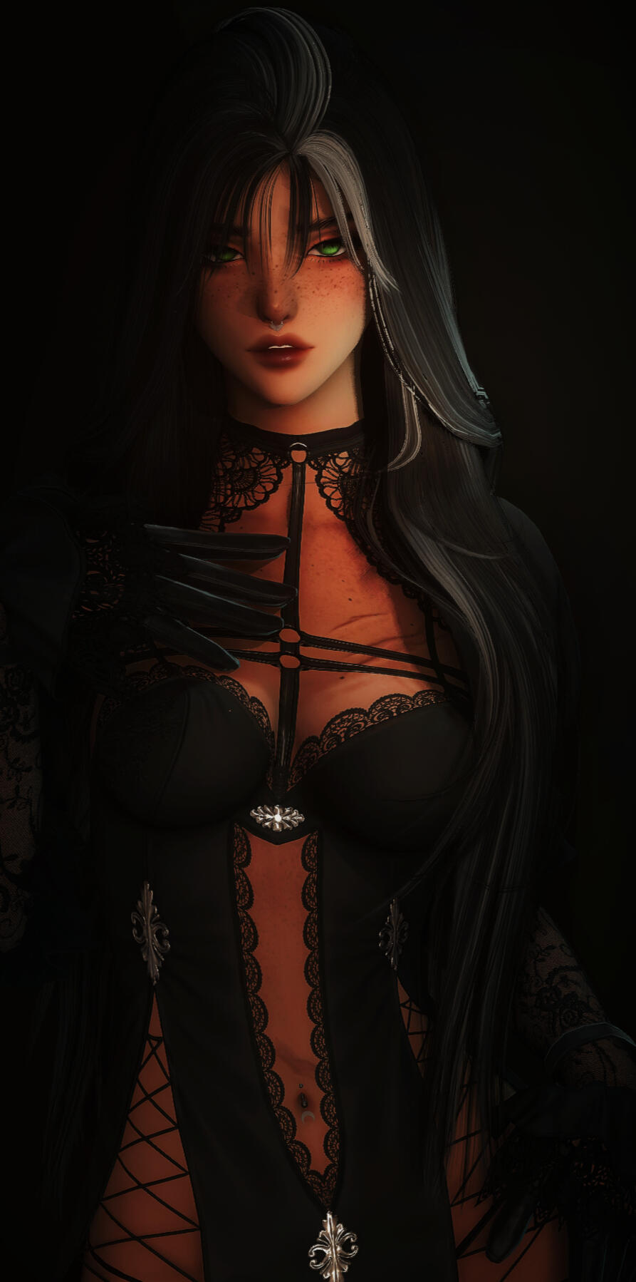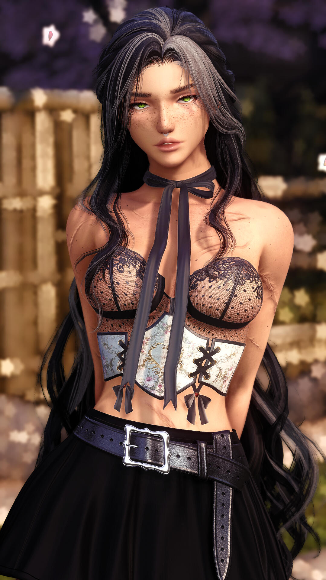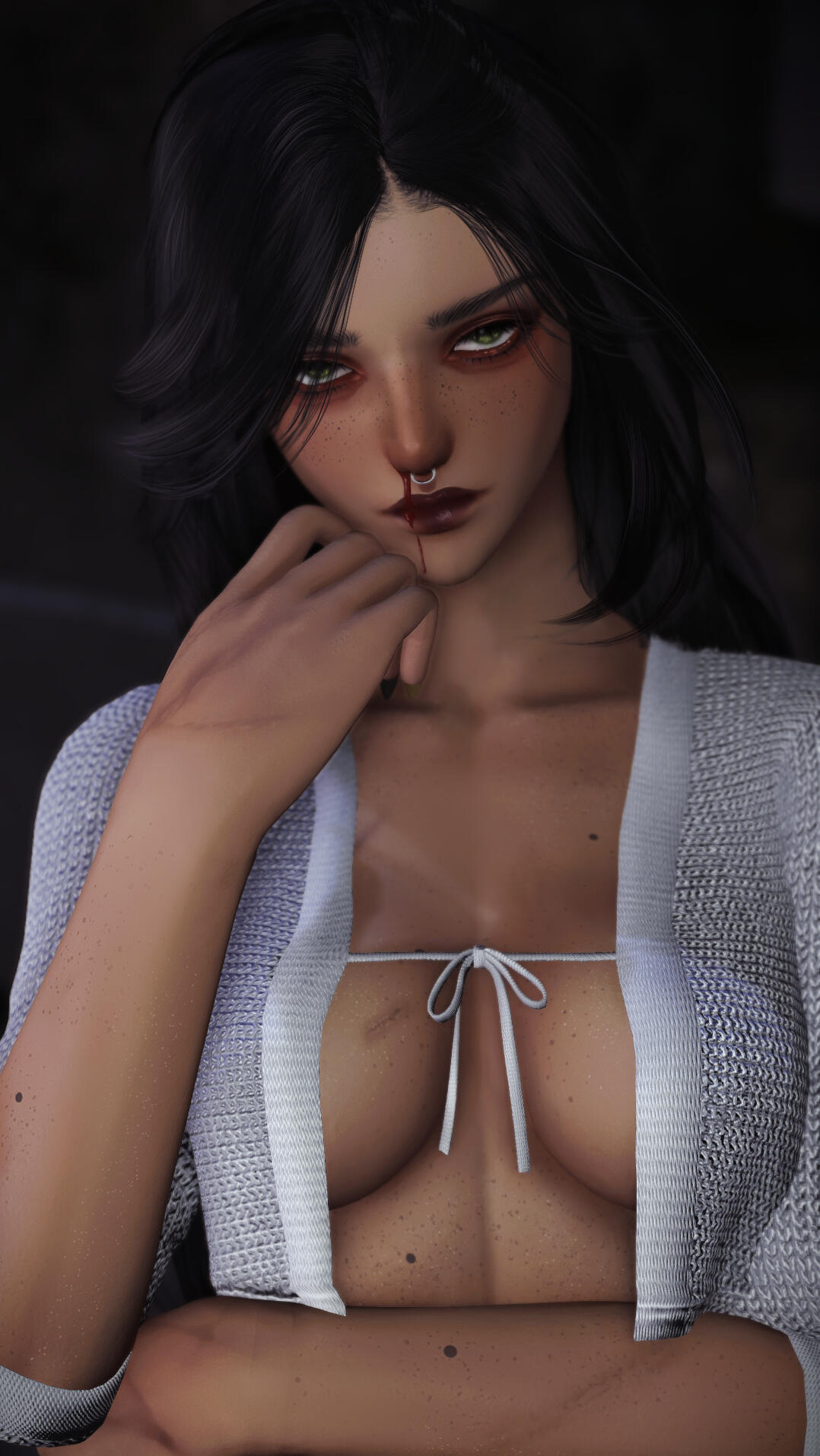 Most of her body is covered in freckles and scars. She does have several piercings as well.